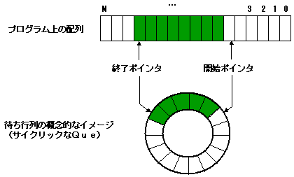 | //宣言分部 private string[] Que=new string[10]; private int QuePointer=0; // dequeue private string Deque() { if(QuePointer==0) {MessageBox.Show("キューが空です."); return "" } else { string R=Que[0]; QuePointer--; for(int i=0;i<QuePointer;i++) Que[i]=Que[i+1];// すべての要素をずらす return R; } } // enqueue private void Enque(string V) { if (QuePointer>=Que.Length) MessageBox.Show("キューが満杯です."); else Que[QuePointer++]=V; } private void 表示() { listBox1.Items.Clear(); for(int i=0;i<QuePointer;i++)listBox1.Items.Add(Que[i]); } private void button1_Click(object sender, System.EventArgs e) { Enque(textBox1.Text); 表示(); } private void button2_Click(object sender, System.EventArgs e) { string R=Deque(); label1.Text=R; 表示(); } |